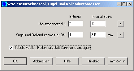 Unter Bearbeiten->Messen gibt es eine Checkbox "Rollenmaß statt Zahnweite anzeigen". Dies wirkte sich bislang nur auf die Tabelle DIN 5480:1991 aus. Jetzt gilt diese Einstellung auch für die Tabelle der Zahnwelle nach DIN 5480:2006. Standardeinstellung ist jetzt "Anzeige Rollenmaß", weil in der neueren DIN nur noch das Rollenmaß in der Tabelle aufgeführt ist.