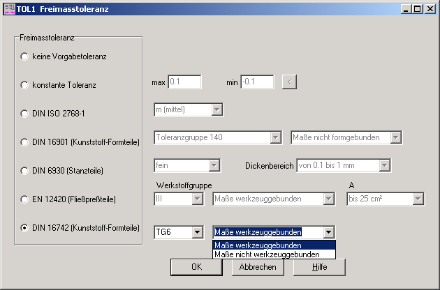 Als Norm zur Festlegung fertigungstechnisch möglicher Toleranzen für Kunststoff-Formteile erschien die neue DIN 16742 als Weißdruck. Die deutsche Version der DIN 16742 vom Oktober 2013 ist verbindlich und ersetzt die 2009 zurückgezogene Norm DIN 16901 von 1982. Die Grenzabmaße sind unterteilt in werkzeuggebundene und nicht werkzeuggebundene Maße, abhängig vom Nennmaßbereich und eingeteilt in 9 Toleranzgruppen TG1 bis TG9. Die Grenzabmaße nach der neuen Norm wurden in TOL1 übernommen. Nach Wahl von Toleranzgruppe und Werkzeugbindung werden bei Eingabe Nennmaß die zugehörigen Toleranzen eingesetzt (Button "Berechnen"). Die Toleranzen nach DIN 16901 wurden auch noch in TOL1 belassen, diese sollen aber nicht mehr verwendet werden.