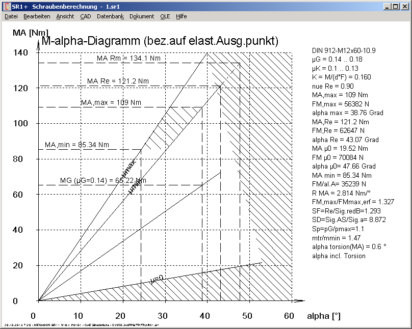 Die Torsion der Schraube beim Anziehen mit Montagedrehmoment MA,max wird jetzt mit ausgedruckt, außerdem kann man unter "Bearbeiten->Berechnungsmethode" konfigurieren, dass die Torsion beim Anziehdrehwinkel berücksichtigt wird. Der Einfluß der Torsion ist allerdings gering, der Anziehdrehwinkel von Schaftschrauben erhöht sich dadurch um ca. 1 – 2 %.