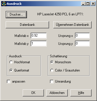 Da immer mehr die überbreiten Flachbildschirme eingesetzt werden und die Standardeinstellung bei Installation so ist, daß der gesamte Bildschirm ausgefüllt wird, werden Zeichnungen zwangsläufig in die Länge gezogen, und Kreise leicht elliptisch dargestellt. Um diesen Effekt zu korrigieren, in der Konfiguration unter "Datei->Einstellungen->Grafik" Fenstergröße x = 1.33 * y berechnen, eingeben und speichern. Der Ausdruck auf Drucker ist normalerweise unabhängig von der Bildschirmeinstellung. Wenn es hier Verzerrungen gibt, können Sie im Druckerfenster "Maßstab x" oder "Maßstab y" entsprechend verkleinern. Oder noch besser mit unsere Zusatzsoftware DXFPLOT maßstäblich ausdrucken, wenn der Drucker PCL5 oder PCL6 versteht.
