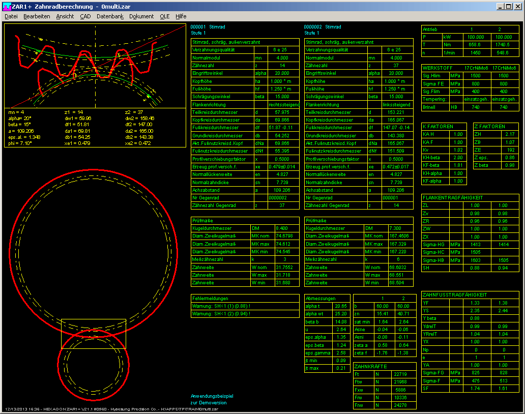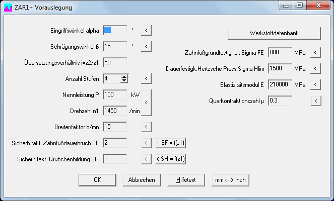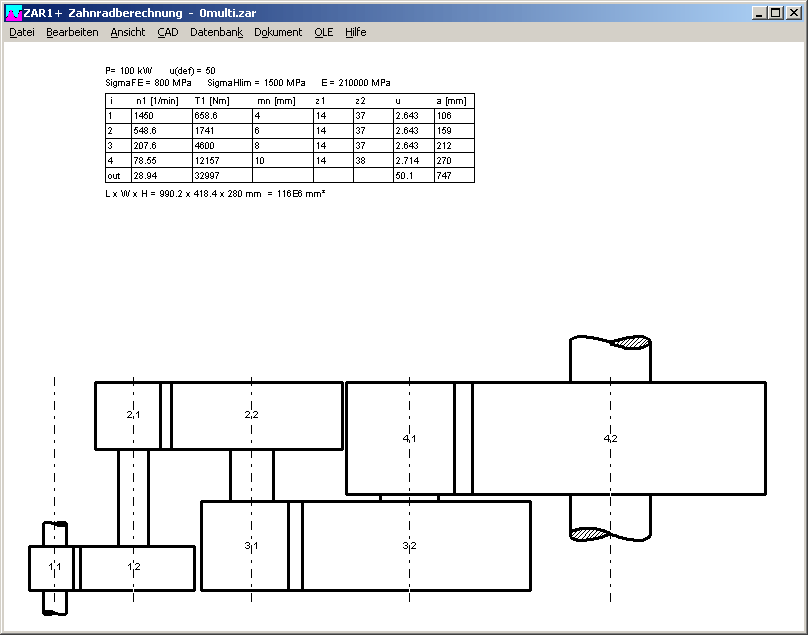 Eingegeben wird das Übersetzungsverhältnis und die Anzahl der Stufen. Dazu Leistung und Eingangsdrehzahl, den Werkstoff für alle Zahnräder kann man aus Datenbank wählen. Vorgabewerte für die Berechnung sind Zahnbreitenfaktor (b = 15 Modul) und die Sicherheiten gegen Zahnfußdauerbruch und Pitting. Aus diesen Angaben berechnet ZAR1+ die einzelnen Stufen, am Bildschirm erhält man eine Zeichnung einer ebenen Getriebeanordnung und eine Tabelle mit den Daten der einzelnen Stufen.