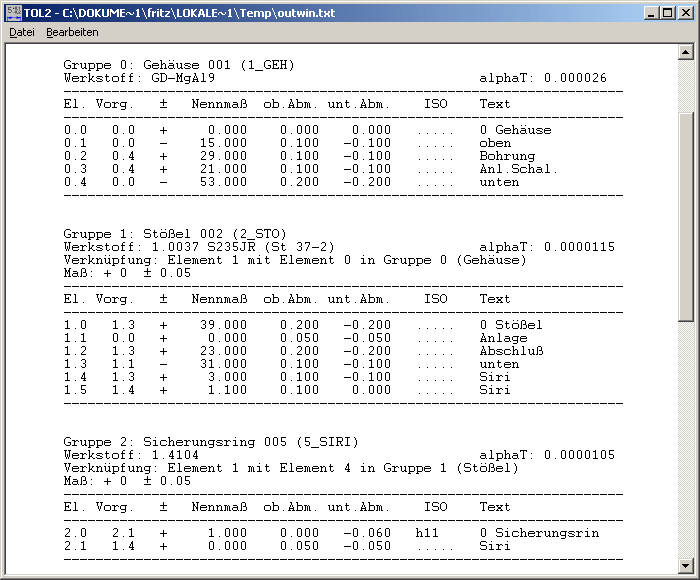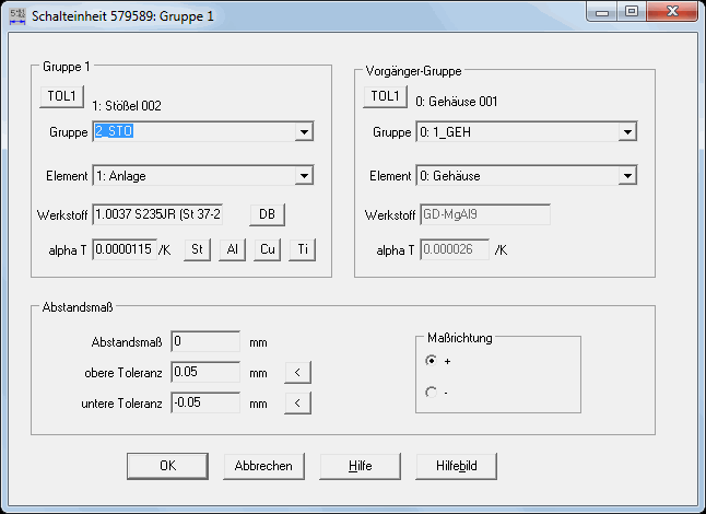 Zu den Elementegruppen in TOL2 kann man jetzt Werkstoff und Wärmeausdehnungskoeffizienten eingeben oder aus der Werkstoffdatenbank wählen. So kann man die temperaturabhängigen Schließmaße von Baugruppen berechnen, welche aus Bauteilen unterschiedlicher Werkstoffe zusammengesetzt sind. Nach Eingabe der Arbeitstemperatur werden die Schließmaße mit Wärmeausdehnung berechnet und angezeigt.