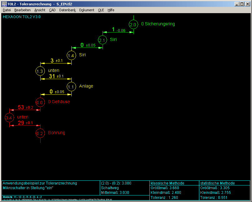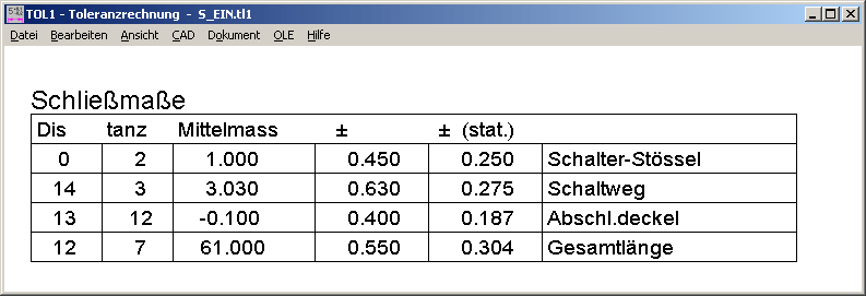 Statt Nennmaß sowie Größt-und Kleinstmaß für Konstantverteilung und Normalverteilung werden in der Tabelle jetzt Mittelmaß und dazu die Toleranzen für Konstant- und Normalverteilung ausgegeben. Das ist übersichtlicher und spart 3 Spalten.