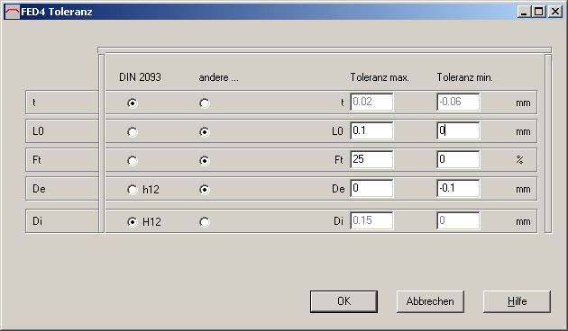 Bislang wurden für Abmessungen und Prüfkraft der Tellerfeder die Toleranzen nach DIN 2093 verwendet. Jetzt kann man alternativ auch selbstdefinierte Toleranzen eingeben.