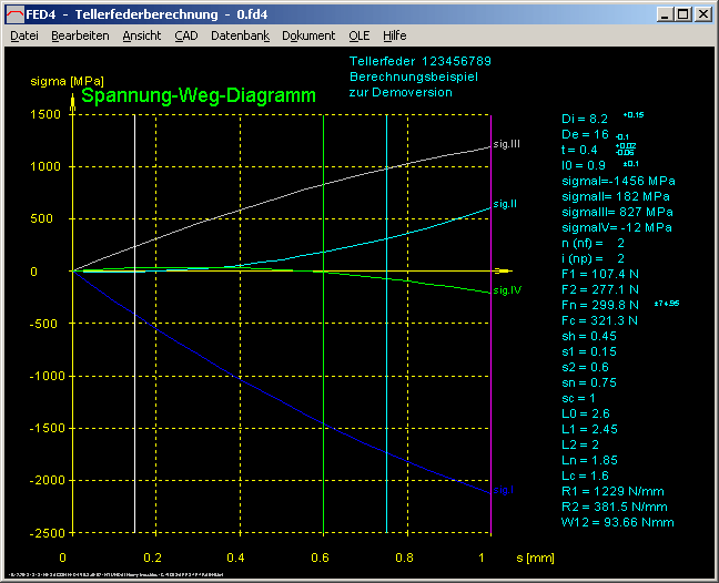 In das Spannungsschaubild werden die Federwege s1, s2, sn und sc eingezeichnet. In FED4 sind s1, s2, sn und sc die Federwege der Tellerfedersäule, die Federwege der Einzeltellerfeder werden mit si1, si2, sin, sic bezeichnet. In der DIN heißen die Federwege der Federsäule oder des Federpakets sges, deren empfohlener Größtwert sges = 0.75(L0-Lt).