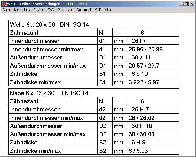 "Parallel Slide Splines for Soft Broaches Holes in Fittings" nach SAE J499a können mit WN9 berechnet werden. Damit die Abmessungen nicht mühsam umgerechnet werden müssen, wurden die verschiedenen Größen in die Datenbank aufgenommen. Da die Tolerierung anders erfolgt als nach DIN/ISO und die Basisdaten auf Zollmaßen beruhen, mussten die Abmessungen DI, DE, B entsprechend umgerechnet werden.