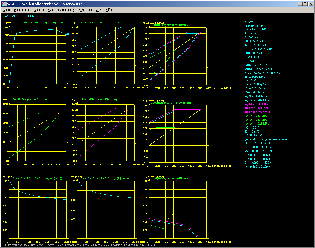 In der neuen Quick3-Ansicht von WST1 werden Spannungs-Dehnungs-Diagramm, Smith-Diagramme Zug/Druck, Biegung, Torsion, Haigh und Goodman-Diagramm sowie Zugfestigkeit und Streckgrenze als Funktion der Werkstoffdicke auf einer Bildschirmseite angezeigt.