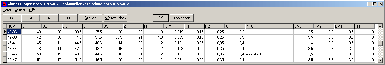 Bisher wurden Kugel- und Rollendurchmesser berechnet nach DIN 3960, oder manuell eingegeben. Jetzt werden die Meßrollendurchmesser von der DIN 5482-Datenbank übernommen. Die DIN 5482-Datenbank wurde um 4 Felder erweitert: DM2: Rollendurchmesser Zahnnabe, FM2: Abplattung Meßrolle für Zahnnabe, DM1: Rollendurchmesser Zahnwelle, FM1: Abplattung Meßrolle für Zahnwelle
