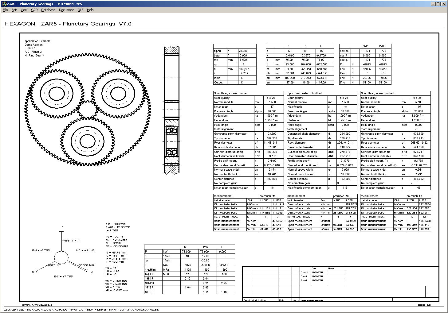 A "production drawing Quick3" as known from other programs is not available in ZAR5: too much data to fit into an A4 drawing frame. But a new "Production Drawing Quick4" is available now in ZAR5, with all data and drawings from Quick3, completed with tables of dimensions and measurement data of sun, planet and hollow gear, altogether in an A3 drawing frame according to ISO 7200 or DIN 6771.