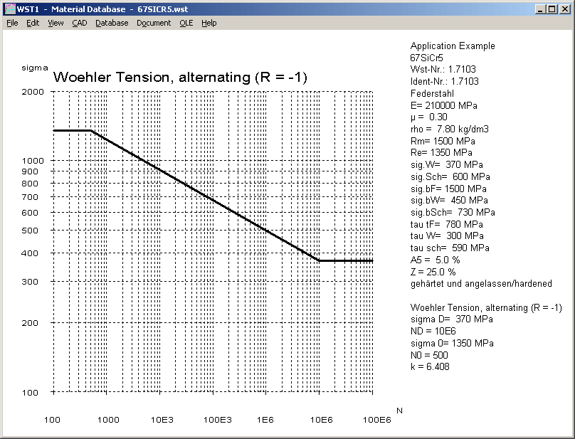 In WST1, you can now create a simple SN diagram. First select load case (tension, bending, torsion) and stress ratio (alternating load, pulsating load). Then you can use "<" buttons to set fatigue strength Sigma D and static strength from material database (if available). ND is set 2E6, and N0=1000 by default.