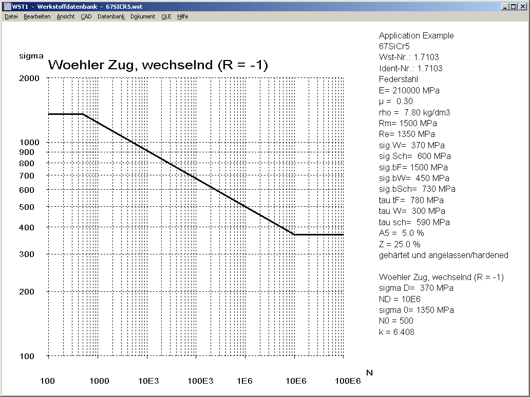 In WST1 kann man jetzt ein einfaches Wöhler-Diagramm konstruieren. Zu wählen sind Lastfall (Zug, Biegung, Torsion) und Spannungsverhältnis (wechselnd, schwellend). Mit den "<" Buttons werden Dauerfestigkeit Sigma D, je nach Auswahl Wechselfestigkeit oder Schwellfestigkeit bei Zug/Druck, Biegung oder Torsion und Grenzfestigkeit (statische Festigkeit) aus den Werkstoffdaten übernommen (sofern vorhanden). Für die Eckschwingzahl ND wird 2 Mill. eingesetzt. Für die Eckschwingzahl N0 werden 1000 Lastspiele gesetzt. Alternativ kann man auch den Neigungskoeffizient k eingeben. Laut Issler/Ruoß/Häfele (Festigkeitslehre Grundlagen, Springer ISBN 3-540-57995-8) verläuft die Wöhlerlinie für nichtgekerbte Proben relativ flach (k=10 bis 15), bei mittlerer Kerbwirkung k=6 bis 10, und bei hoher Kerbwirkung k=4 bis 6.