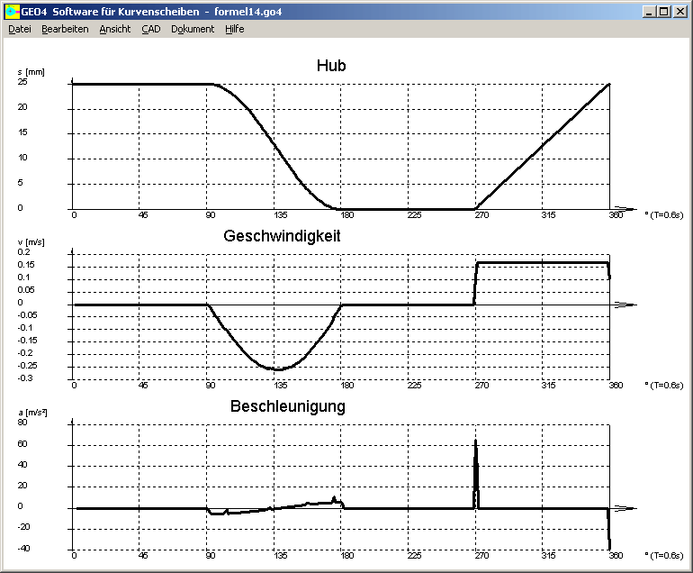 Beispiel für eine Kurvenscheibe mit R=100mm von 0° bis 90°, und R=75mm von 180° bis 270°.
