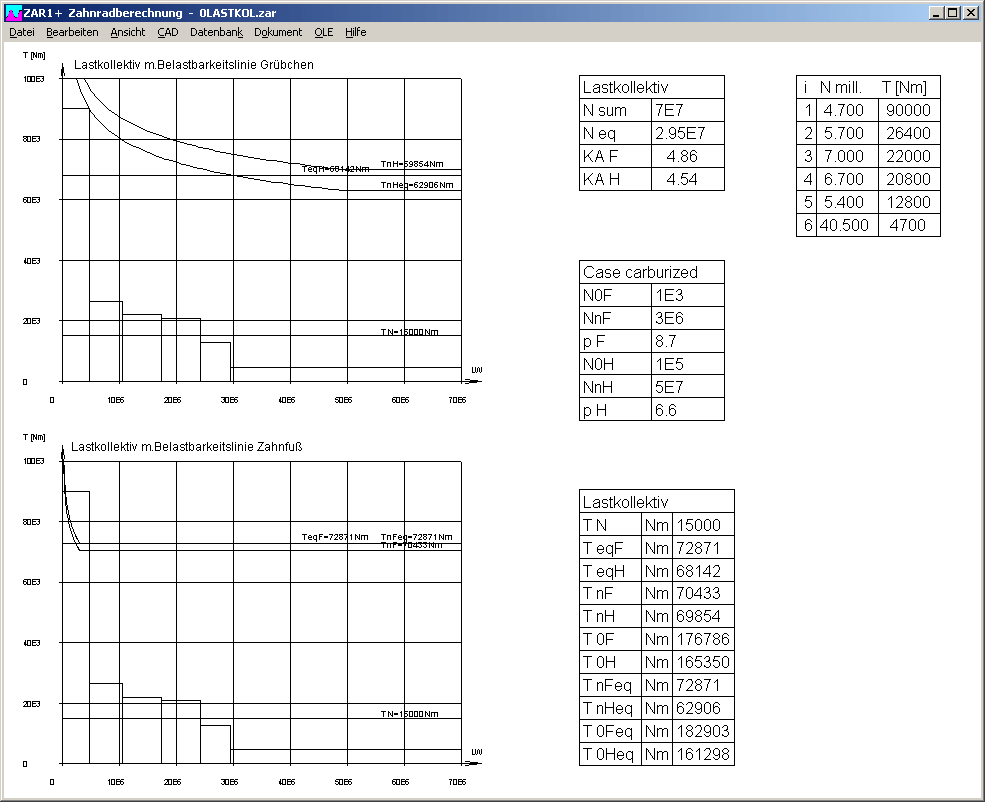 In ZAR5 kann man jetzt ähnlich wie in ZAR1+ ein Lastkollektiv eingeben. Dabei definiert man die Drehmomente an der Eingangswelle und die zugehörigen Umdrehungen der Welle. Also nicht die Lastspiele, weil dies beim Planetengetriebe am Sonnenrad und Hohlrad von der Anzahl der Planetenräder abhängt, und bei den Planetenrädern wechselnde statt schwellende Last auftritt. Dies ist aber bei der Festigkeitsberechnung bereits berücksichtigt.