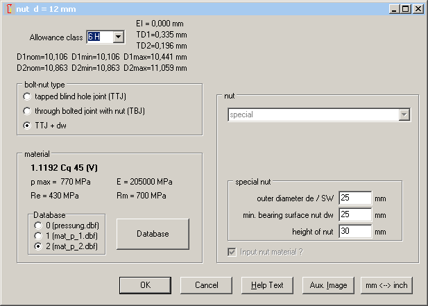 If you selected "special bolt head" in the past, maybe you got a message "D=xx not found – Append dbf", and you first had to define the bolt head data in the "sondkopf" database. Now, for all thread sizes a "special bolt head" was defined with head height h =3d, external diameter de=4d, and bearing diameter dw=3d. Such a bolt head can be used if a stud instead of a bolt should be calculated. In this case, bolt head is assumed as body with screwed-in stud.