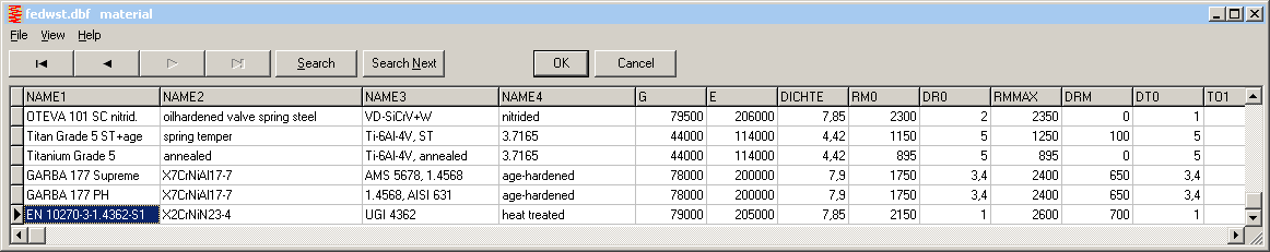 New material has been added to fedwst.dbf database (No.88). Data according to data sheet UGI 4362. Properties: tensile strength as 1.4310-HS, corrosion-resistant as 1.4401.