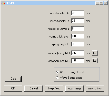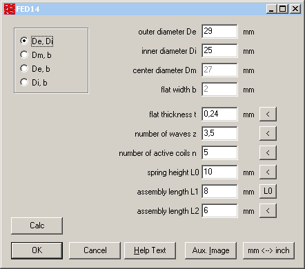 In pre-dimensioning, just input two spring loads and stroke, or only one spring load and deflection, and FED14 calculates dimensions. To vary results, you can edit number of waves, coil ratio, safety sigmaz/sigma2 or ratio of block deflection sc/s2.