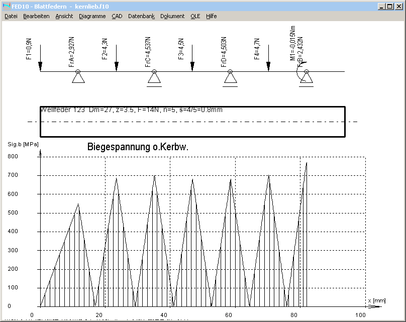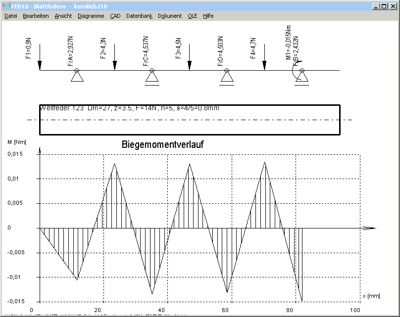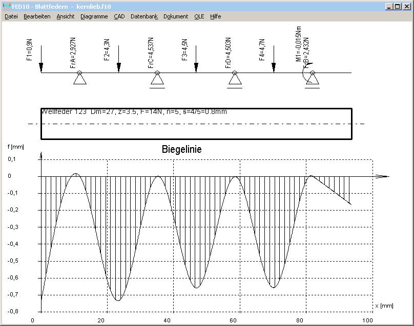 Man kann einen Abschnitt der Feder auch mit der FED10-Software für Blattfedern berechnen, hier eine Windung mit 3,5 Wellen. Das Federband ist gelagert auf einem Festlager und 3 Loslagern. Die Einzelkräfte sind die Auflagerkräfte der nächsten Windung. Die Kräfte sind so zu verteilen, daß die Durchbiegung gleich ist. Links ist das Federende, und auf das Lager rechts wirkt ein Biegemoment von der ersten Welle der nächsten Windung.