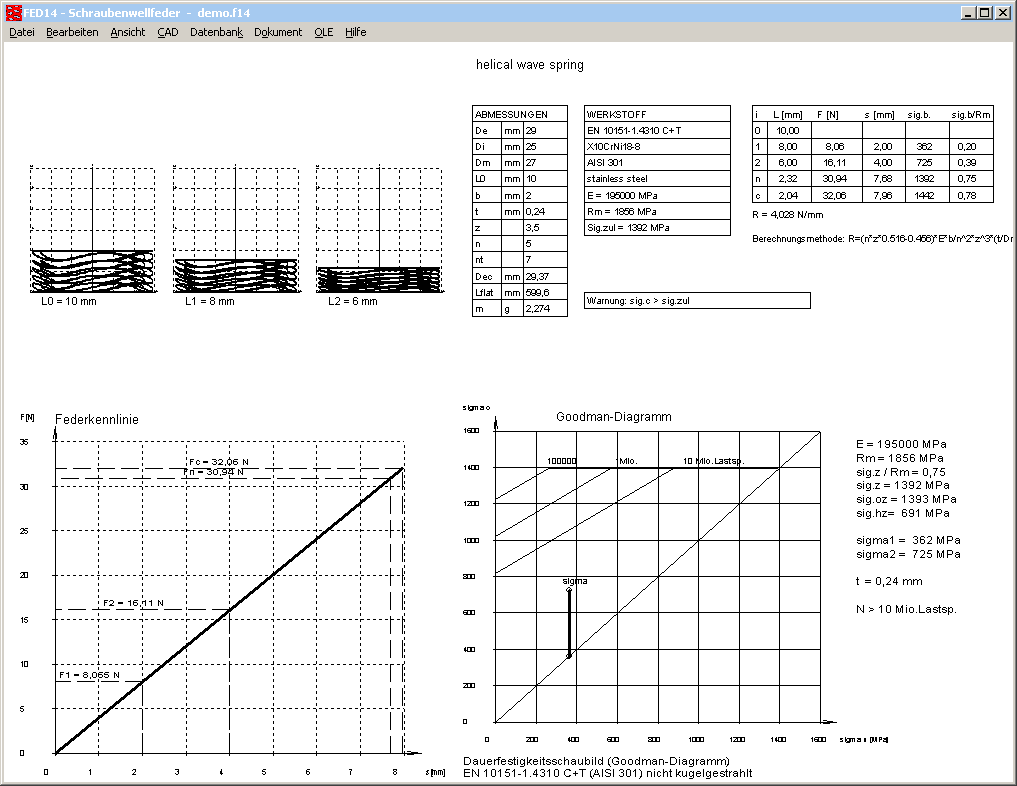 Bei den Federn aus Federbandstahl wird die zulässige Biegespannung mit 0,75 Rm (75% Zugfestigkeit) berechnet. Der Faktor 0,75 ist nicht fix, sondern kann in der Werkstoffdatenbank fed9wst.dbf verändert werden. In FED9 und FED13 (ebenso wie in FED14 und FED15) bewirkt eine Änderung des Biegespannungsfaktors jetzt auch entsprechende Änderungen im Goodman-Diagramm und bei der Lebensdauerberechnung