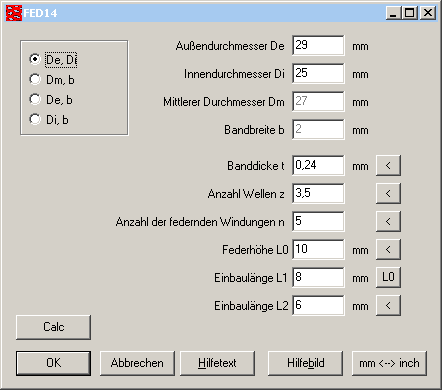 Wenn die Blattfeder einfach nur ein Stück Federband ist (wie in FED15), gibt es jetzt eine vereinfachte Eingabe für Breite, Dicke und Länge der Wellfeder. Diese kann man unter "Bearbeiten -> Berechnungsmethode" konfigurieren.