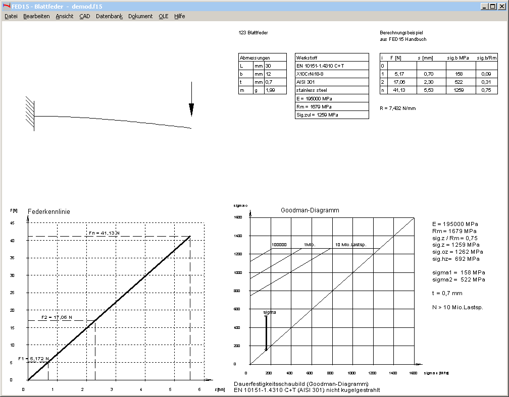 In FED15 gibt es auch eine Vorauslegung: Aus ein oder zwei Federkräften und einem Federweg bzw. Hub wird eine passende Blattfeder berechnet. Die Abmessungen können über die Parameter Federlänge/Federweg und Sicherheit bei F2 variiert werden.