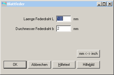 Unter "Berechnungsmethode" kann man jetzt konfigurieren, daß statt einer flachen Blattfeder aus Bandstahl eine Biegefeder aus rundem Federdraht berechnet wird. Wenn diese Option gewählt wird, ist unter Bearbeiten->Geometrie nur Drahtdurchmesser und Länge einzugeben, und bei der Werkstoffauswahl erscheint die fedwst.dbf Werkstoffdatenbank mit Federdraht anstelle der fed9wst.dbf mit Bandstahl.