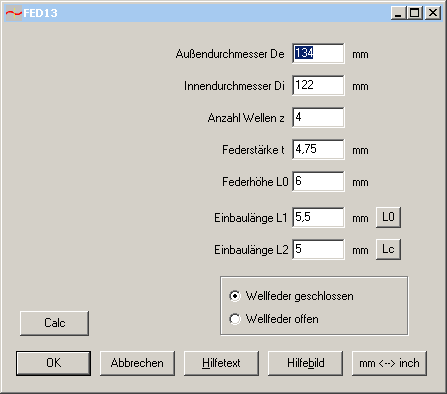 Bei der Eingabe der Abmessungen gibt es einen neuen "Calc" Button für die Berechnung der Feder und Anzeige der Ergebnisse im Hintergrundfenster.