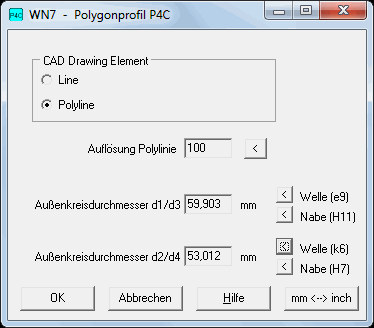 Unter CAD->P4C kann man jetzt wie in WN6 das P4C-Profil von Welle und Nabe als DXF- oder IGES-Datei maßstäblich ausgeben und in CAD übernehmen. Das P4C-Profil ist keine durchgehende Zykloidenkurve wie P3G in WN6. Die Zykloide wird durch den Außenkreisdurchmesser d1 bei der Welle und d3 bei der Nabe begrenzt. Das Profil besteht aus 4 Teilen einer Zykloidenkurve und 4 Kreisbogen mit d1/d3. Die Zykloidenkurve ist in DIN 32712 und in den Zeichnungen als Radius r = d2/2 + 16e dargestellt, in der neuen CAD-Profilzeichnung wird die Zykloidenkurve gezeichnet. Das Profil kann als LINE/ARC oder als POLYLINE generiert werden, die Auflösung der Zykolidenkurve ist konfigurierbar. Mit den "<" Buttons für Welle und Nabe wird d1/d3 und d2/d4 in Toleranzmitte berechnet, man kann aber auch andere Werte für Außen- und Innenkreisdurchmesser eingeben.