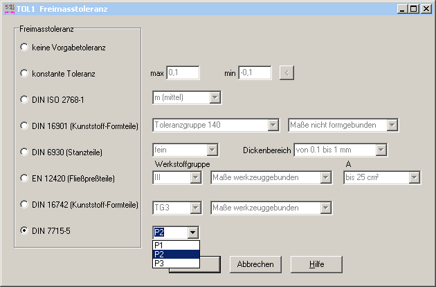 In die Auswahl der Freimaßtoleranzen wurde DIN 7715 Teil 5 mit Toleranzen für Gummiteile, Platten und Stanzteile aus Elastomeren aufgenommen. Bei der Eingabe des Nennmaßes wird mit "Calculate" die eingestellte Freimaßtoleranz übernommen.