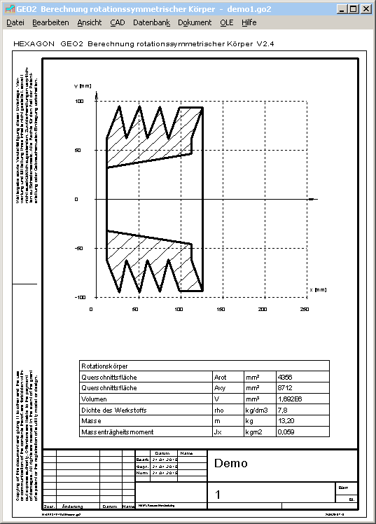 Mit GEO2 wird das Massenträgheitsmoment eines beliebigen Rotationskörpers berechnet, indem man die Rotationsfläche definiert. Für Kugel, Zylinder, Kugel mit Bohrung, Hohlzylinder, Kegel, Kegelstumpf, Kegelstumpf mit Bohrung, Kreisring und Ellipsoid muß man nur noch die Durchmesser und Höhe anstelle der Rotationsfläche eingeben.