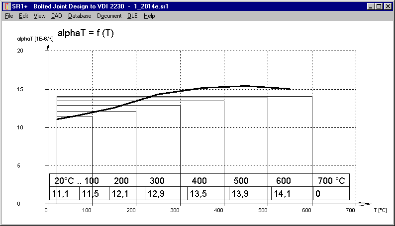 Wenn man unter "Ansicht -> Werkstoff -> Schraube (mat_bolt)" die Eigenschaften der verschiedenen Schraubenwerkstoffe durchblättert, fällt auf, daß der Wärmeausdehnungskoeffizient bei 1.4980 erstaunliche Sprünge macht. Und auch bei 2.4952 ist der Ausdehungskoeffizient bei 150°C geringer als bei 20°C. Entweder muß dies eine spezielle Eigenschaft von Chrom-Nickel-Stählen sein, oder die Tabelle A10 in VDI 2230-1:2015 ist hier fehlerhaft.
