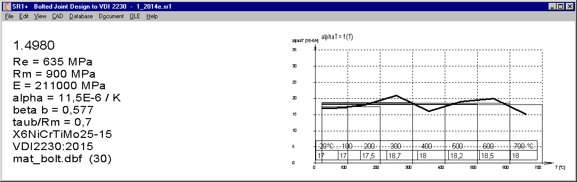 Die Warnung "mat_bolt.alphaT<>mat_b_at20!" besagt, daß sich der Wärmeausdehungskoeffizient aus der Datenbank mit Basisdaten von dem Wert bei 20°C in der Temperatur-Datenbank Re=f(T) unterscheidet. Dies kann aber auch daran liegen, daß bei den Basisdaten bisweilen nicht der Wert für die Längenänderung bei 20°C angegeben wird, sondern wie im Fall der VDI 2230 der thermische Ausdehnungskoeffizient für eine Erwärmung von 20°C auf 100 °C.