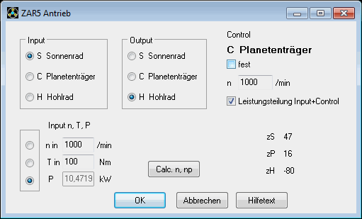 Sonnenrad, Planetenträger und Hohlrad eines Planetengetriebes werden verkuppelt mit Antriebswelle (Input), Abtriebswelle (Output) und Kontrollwelle (control). Bei blockierter Kontrollwelle wirkt die volle Antriebsleistung auf die Antriebswelle. Anders ist es, wenn Antriebs- und Kontrollwelle verbunden sind (für direkte Übersetzung), oder wenn Antriebs- und Kontrollwelle vom selben Motor mit unterschiedlichen Getriebeausgängen angetrieben werden (ncontrol<>0). In diesem Fall kann man jetzt "Leistungsteilung Input + Control" ankreuzen, dann wird die Antriebsleistung zwischen Antriebswelle und Kontrollwelle aufgeteilt, so daß "P_input + P_control = P" und "T_input + T_control = T" ergibt. Ohne Leistungsverteilung wirkt die volle Leistung auf die Antriebswelle (input), und das errechnete Drehmoment und die Leistung auf die Kontrollwelle muß extern aufgebracht oder abgeführt werden.