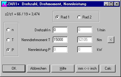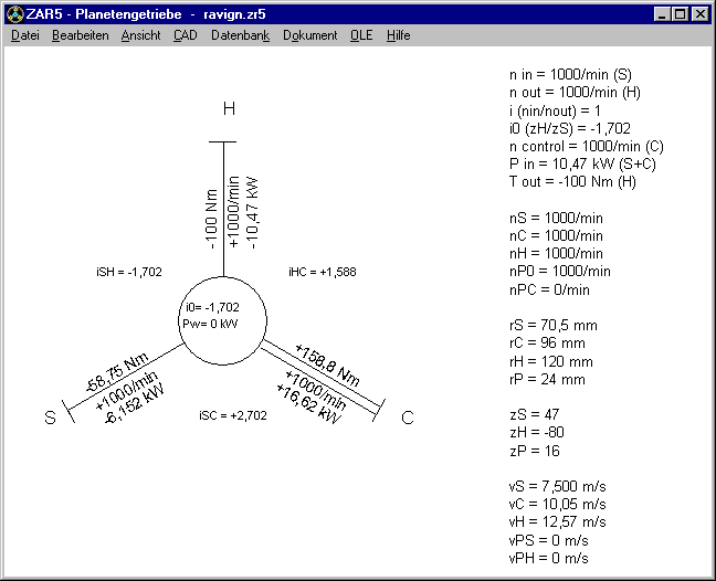 Ergänzend zu den Drehmomenten an Sonnenrad (S), Steg (C) und Hohlrad (H) werden jetzt auch Drehzahlen und Leistungen an den Wellen angegeben, sowie Standübersetzung i0 und Wälzleistung Pw im Planetengetriebe.