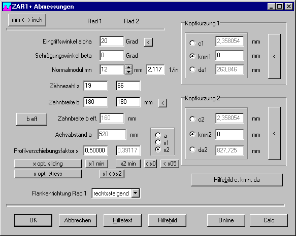 Im Eingabefenster kann man wählen, ob Achsabstand a oder Profilverschiebung x1 oder x2 berechnet werden soll. Die Eingabe war nicht immer übernommen worden, da Neuberechnung erst nach Verlassen des Eingabefeldes. Jetzt wird nach jeder Änderung von a oder x1 oder x2 der gewählte Wert sofort neu berechnet und angezeigt.