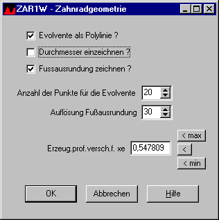 Vor dem Generieren des Zahnprofils kommt ein Eingabefenster mit Einstellmöglichkeiten für Erzeugungs-Profilverschiebungsfaktor bzw. Zahnspiel, Genauigkeit Evolvente und Fußausrundung, Zeichnungsdaten.