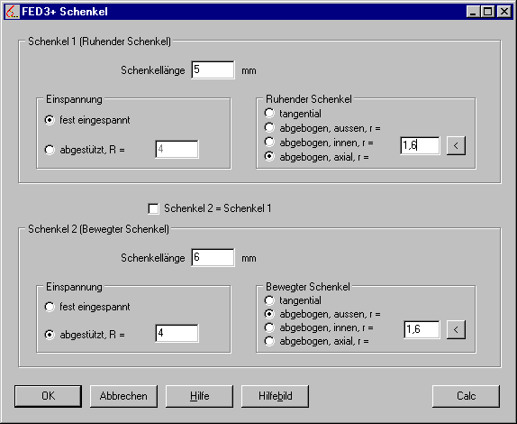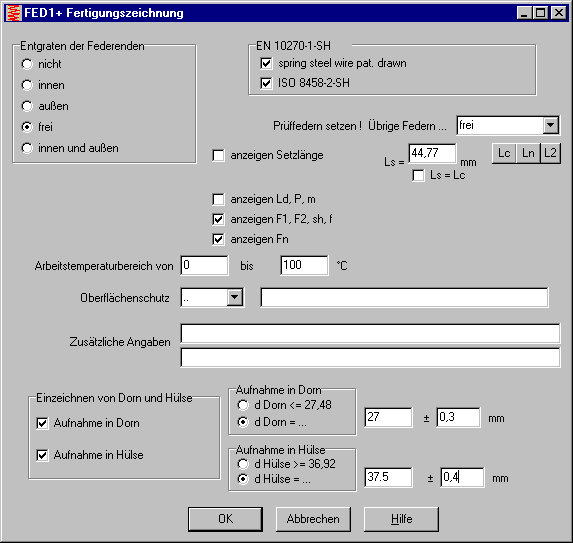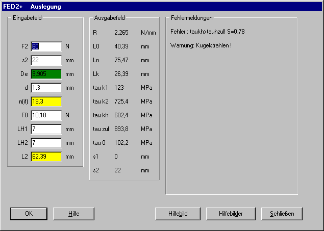 Wenn ein Eingabefenster grün ist, wird der eingegebene Wert nur näherungsweise übernommen. Dies ist z.B. bei der Auslegung von Zugfedern oder Schenkelfedern der Fall, weil die berechnete Windungszahl auf die Ösenstellung bzw. den Schenkelwinkel gerundet werden muß und der Rest über den Windungsdurchmesser ausgeglichen wird.