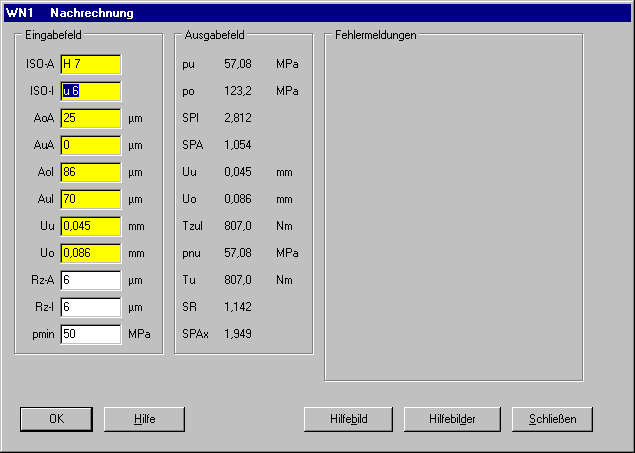 In der Nachrechnung von zylindrischen Preßverbänden mit WN1 gibt es eine Menge gelber Felder: Wenn man die ISO-Toleranzen für Außen- und Innenteil eingibt, werden daraus die Abmaße A und daraus wieder die Überdeckung U berechnet. Wenn man die Abmaße verändert, wird die ISO-Toleranz gelöscht und die Überdeckung neu berechnet. Wenn man die Überdeckung direkt eingibt, werden alle Abmaße und ISO-Toleranzen gelöscht.