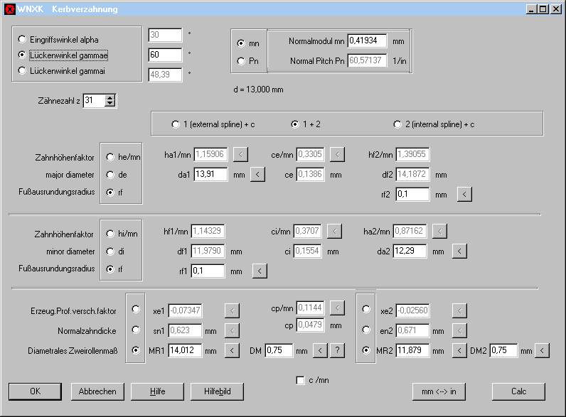Eingeben kann man entweder die Abmessungen von Wellenprofil und Nabenprofil (Kopfspiel und Flankenspiel werden berechnet), oder Wellenprofil und Spiel oder Nabenprofil und Spiel (Gegenprofil wird berechnet).