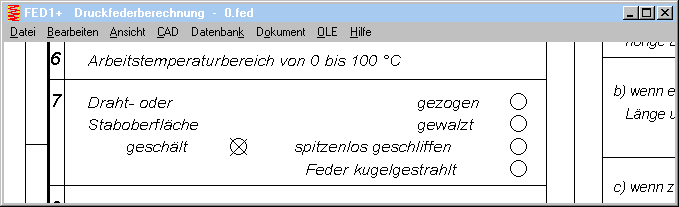 Wenn für warmgeformte Federn gezogene Oberfläche angehakt wird, oder gewalzte oder geschliffene Oberfläche für kaltgeformte Federn, wird die Oberflächeneingabe vom Programm korrigiert.