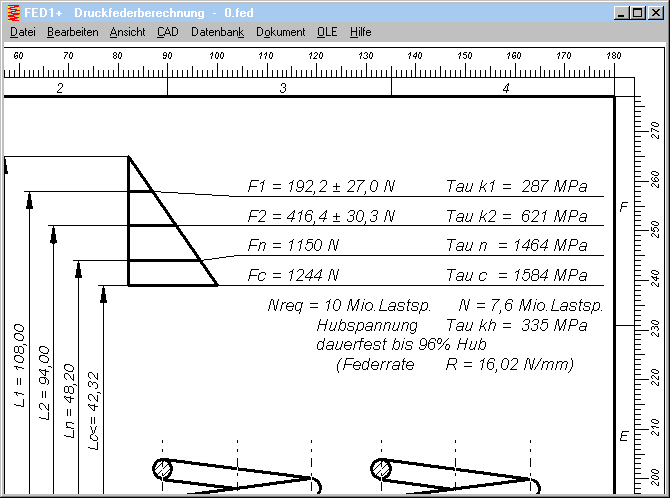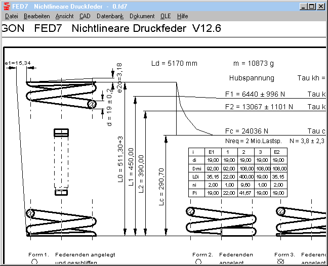 In FED1+ gibt es 2 verschiedene Berechnungen vom Windungsdurchmesser Dec: einmal Dec nach Norm, und dann "De" in der Quick3-Tabelle nach eigenen Formeln. Bei der Berechnung nach eigener Formel wird die Drahtlänge auf den Durchmesser zurückgerechnet: D = L/(pi*nt), unter Berücksichtigung von angelegten Endwindungen. Diese Berechnung hat den Vorteil, daß nicht nur die Vergrößerung des Windungsdurchmessers bei Blocklänge, sondern für jede beliebige Federlänge berechnet werden kann.