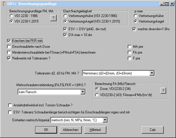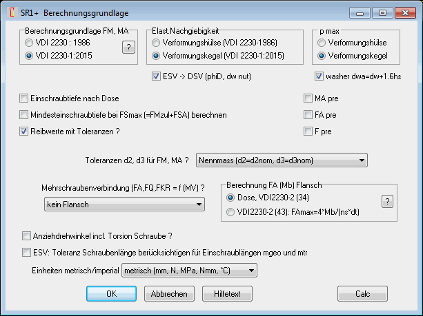 Ob die Flächenpressung von Unterlegscheiben mit der Formel (193) nach VDI 2230-1:2015 berechnet werden soll oder nicht, kann man jetzt unter Berechnungsmethode konfigurieren. "dwa=dw+1.6hs" entspricht einem Kegelwinkel von ArcTan(0.8)=38.7°. Für SR1+ ist dann ein Klemmteil eine Unterlegscheibe, wenn die Dicke L < 0.5 * Innendurchmesser Di. Angewendet wird die Formel auf das erste Klemmstück sowie bei DSV mit Mutter auch auf das letzte Klemmstück.