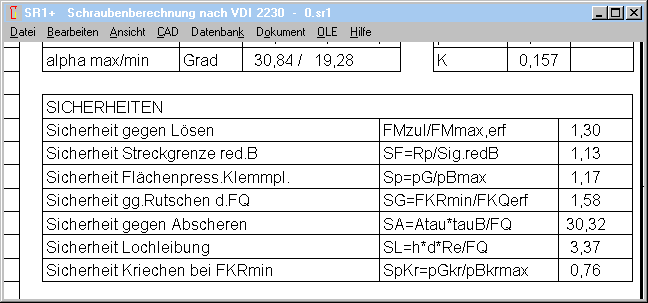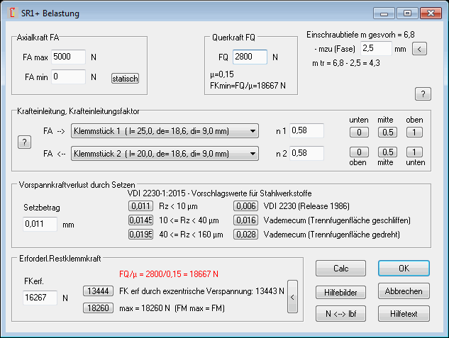 Die erforderliche Restklemmkraft muß größer sein als die berechneten Mindestwerte bei Querkraft oder exzentrischer Last, und kleiner als die berechnete Mindestklemmkraft bei FAmax (FKRmin=max). Wenn für max (FKRmin) ein negativer Wert berechnet wird, ist FAmax zu groß, das wird jetzt rot angezeigt. Wenn FQ/µ oder Fkerf,exz. größer sind als max, wird der Text jetzt auch rot angezeigt und die Übernahmebuttons verschwinden.