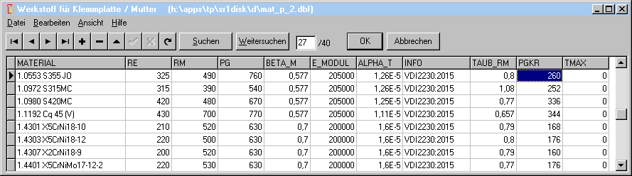 In den Werkstoffdatenbanken für Klemmplatten gibt es jetzt zwei zusätzliche Felder: PGKR mit der zulässigen Flächenpressung, bei welcher kein Kriechen auftritt sowie TMAX mit der zulässigen Arbeitstemperatur. Wo keine Daten vorliegen, ist für pGkr = Rp0.2 * 0,8 (80% Streckgrenze) gesetzt. Bei Überschreitung der zulässigen Arbeitstemperatur TMAX (falls TMAX>0) wird eine Fehlermeldung angezeigt