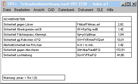 Für die meisten Werkstoffe ist in VDI 2230-1:2015 eine zulässige Flächenpressung pG größer als die Zugfestigkeit und weit oberhalb der Streckgrenze angegeben. Das ist möglich, wenn ein mehrachsiger Spannungszustand vorliegt bzw. genügend umliegendes Material vorhanden ist, welches innenliegendes Material stützt, falls plastifiziert. Bei einer Hülse sind diese hohen Flächenpressungen unzulässig. Deshalb erscheint jetzt eine Warnung "pmax > Re" falls der Verformungskörper identisch mit den geometrischen Abmessungen und die Flächenpressung größer als Streckgrenze ist.