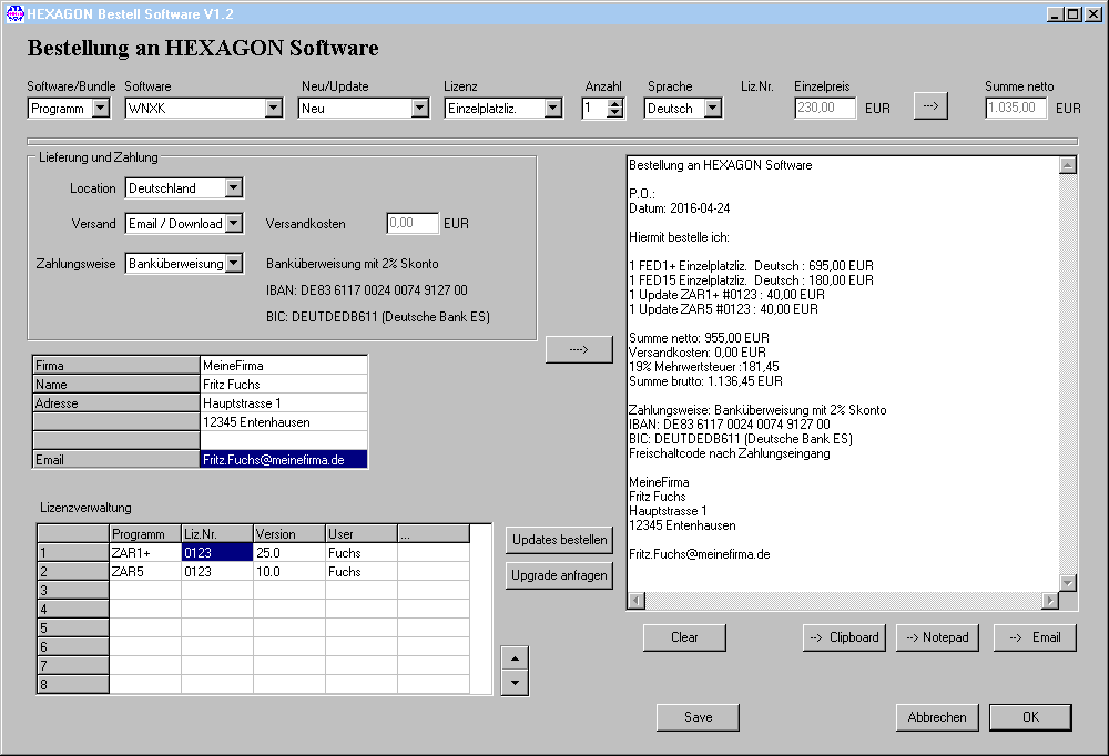 Unter "Lizenzverwaltung" können Sie alle Ihre Programme mit Lizenznummern, aktueller Version und Anwender eingeben. Auf Knopfdruck wird dann eine Update-Bestellung im Textfeld rechts generiert. Nicht benötigte Updates kann man dort löschen, den Text beliebig ändern, dann als Email versenden, oder via Zwischenablage oder Notepad in die eigene Bestellsoftware übernehmen.
