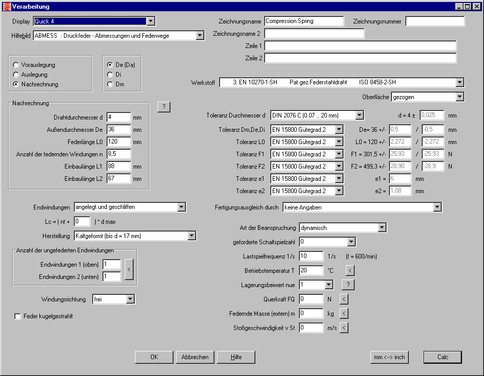 Nur Spezialeingaben wie Einzeleingabe von Werkstoffkennwerten, Auslegung Werkstoff, Auslegung Einbauraum, Nachrechnung Federkennlinie oder Lastkollektiv muß man weiterhin aus dem "Bearbeiten"-Menü wählen. Für die neue Quick-Eingabe ist eine hohe Bildschirmauflösung hilfreich, dann kann man Dialogfenster und Grafikfenster nebeneinander positionieren.