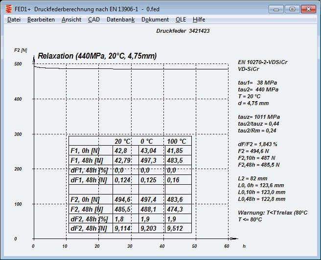 In den Relaxation-Zeit-Diagrammen Rx%=f(t) und RxF2=f(t) war eine Tabelle mit abweichenden Relaxationsdaten für Arbeitstemperatur und Temperatur von/bis (aus Fertigungszeichnung) angegeben. Die Tabelle wurde korrigiert, außerdem wurde die Federlänge L1 aufgenommen. Und in FED1+ und FED2+ wurde das Relaxationsdiagramm in die Quick4-Ansicht aufgenommen.