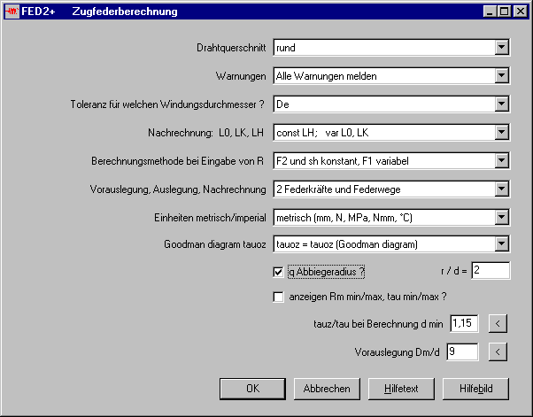 Gleich wie bei FED1+ kann man jetzt auch bei Zugfedern und Schenkelfedern die Federrate direkt eingeben. Unter "Bearbeiten->Berechnungsmethode" kann man einstellen, ob sich dadurch F1 bzw, T1 oder F2 bzw. T2 oder der Hub sh bzw. alphah verändern soll.