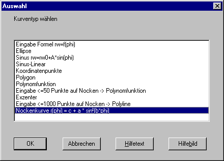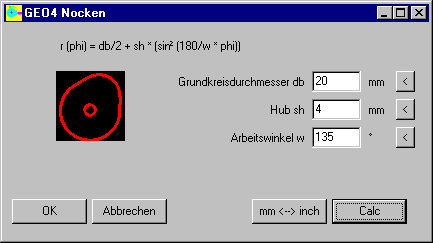 Die Parameter Hub, Arbeitswinkel und Grundkreisdurchmesser der klassischen Nockenkurve r (phi) = c + a * sin² (b*phi) kann man jetzt auch direkt eingeben. Das spart Zeit sowohl bei der Eingabe als auch bei der Berechnung und Animation.