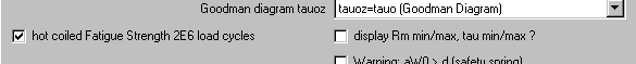 Goodman diagrams for hot-coiled springs are valid for spring materials to EN10089 with ground or shaved surface. At "Edit->Production" you must set "hot-coiled, steel with reworked surface" and at "Edit->Material->Surface" "ground" or "shaved". For hot-rolled spring steel with drawn or rolled surface is no Goodman diagram available. Instead of 3 curves for 10 million, 1 million and 100,000 load cycles, new Goodman diagram for hot-rolled springs shows only 2 curves: for 2 million cycles and 100,000 cycles.
